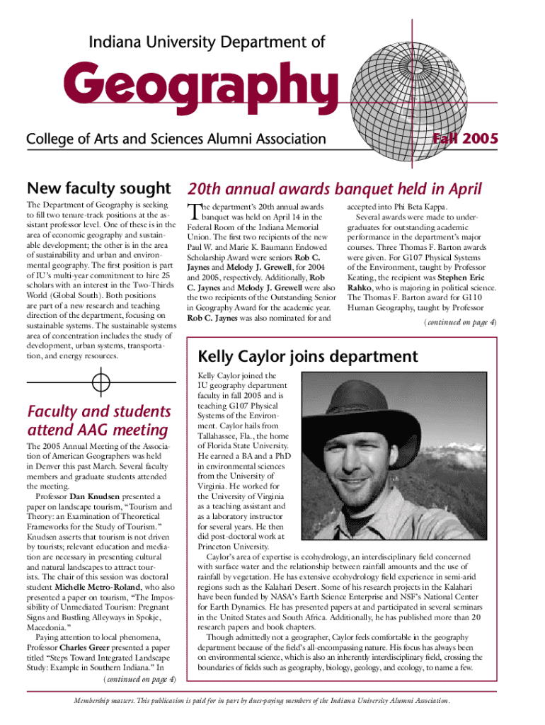 Fall 2005New faculty sought 20th annual awards banquet held in April The Department of Geography is seeking to ll two tenuretrack positions at the assistant professor level. One of these is in the