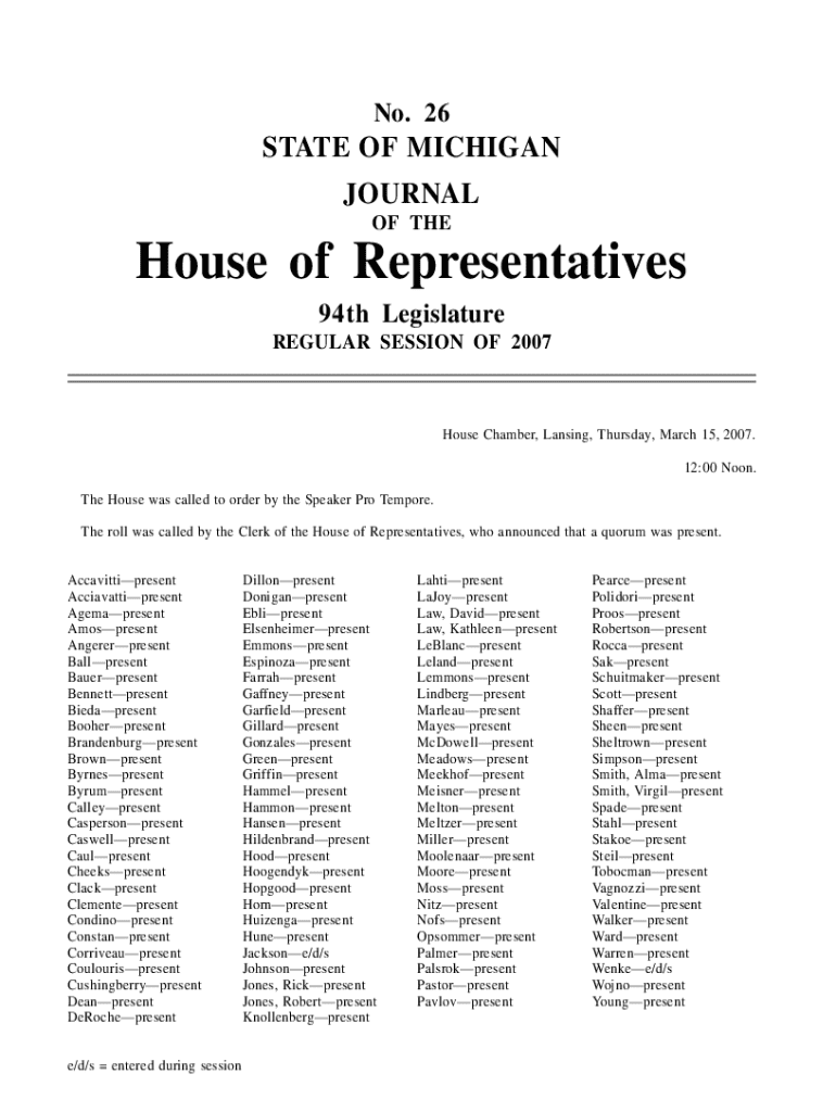 REGULAR SESSION OF 2007House Chamber, Lansing, Thursday, March 15, 2007.