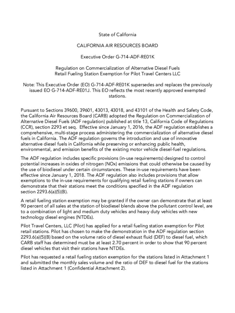 State of California CALIFORNIA AIR RESOURCES BOARD Executive Order G714ADFRE01K Regulation on Commercialization of Alternative Diesel Fuels Retail Fueling Station Exemption for Pilot Travel Centers