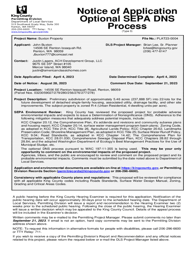 Permitting Division Department of Local Services 919 Southwest Grady Way, Suite 300 Renton, WA 98057 2062966600 TTY Relay: 711 www.kingcounty.gov/permitsNotice of Application Optional SEPA DNS Process