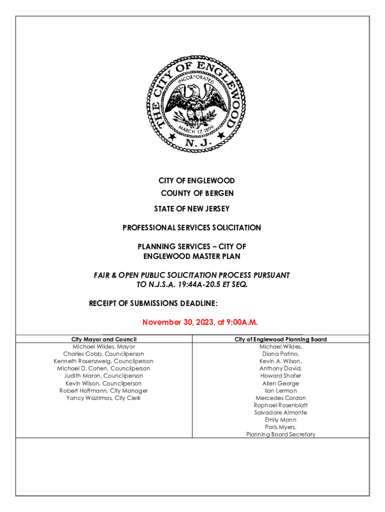 CITY OF ENGLEWOOD COUNTY OF BERGEN STATE OF NEW JERSEY PROFESSIONAL SERVICES SOLICITATION PLANNING SERVICES CITY OF ENGLEWOOD MASTER PLAN FAIR & OPEN PUBLIC SOLICITATION PROCESS PURSUANT TO N.J.S.A.