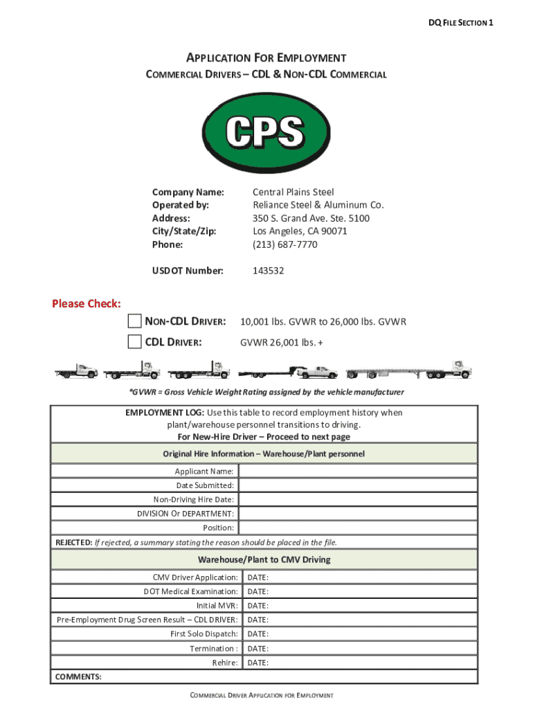 DQ FILE SECTION 1APPLICATION FOR EMPLOYMENTCOMMERCIAL DRIVERS CDL & NONCDL COMMERCIALCompany Name: Operated by: Address: City/State/Zip: Phone:Central Plains Steel Reliance Steel & Aluminum Co. 350