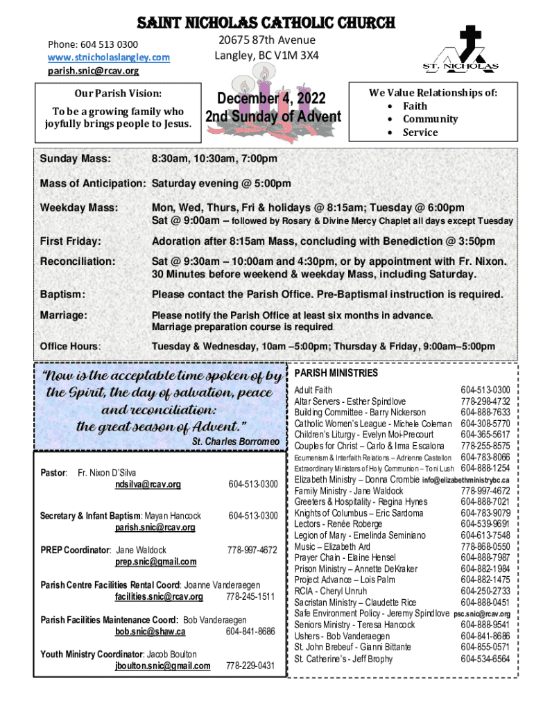 Saint Nicholas Catholic Church 20675 87th Avenue Langley, BC V1M 3×4Phone: 604 513 0300 www.stnicholaslangley.com parish.snic@rcav.org Our Parish Vision: To be a growing family who joyfully brings