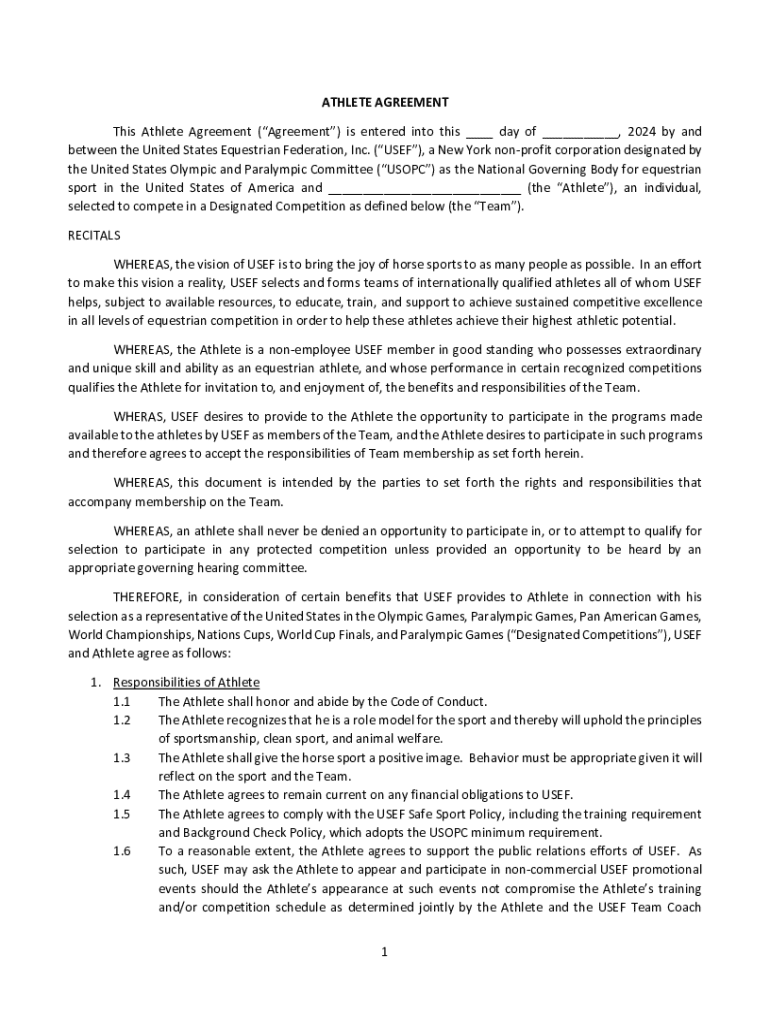 ATHLETE AGREEMENT This Athlete Agreement (Agreement) is entered into this ___ day of ___, 2024 by and between the United States Equestrian Federation, Inc. (USEF), a New York nonprofit corporation