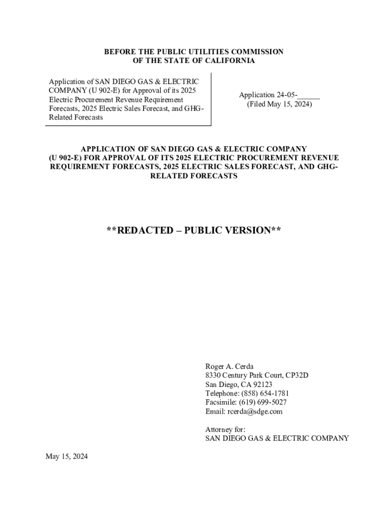 BEFORE THE PUBLIC UTILITIES COMMISSION OF THE STATE OF CALIFORNIA Application of SAN DIEGO GAS & ELECTRIC COMPANY (U 902E) for Approval of its 2025 Electric Procurement Revenue Requirement Forecasts,