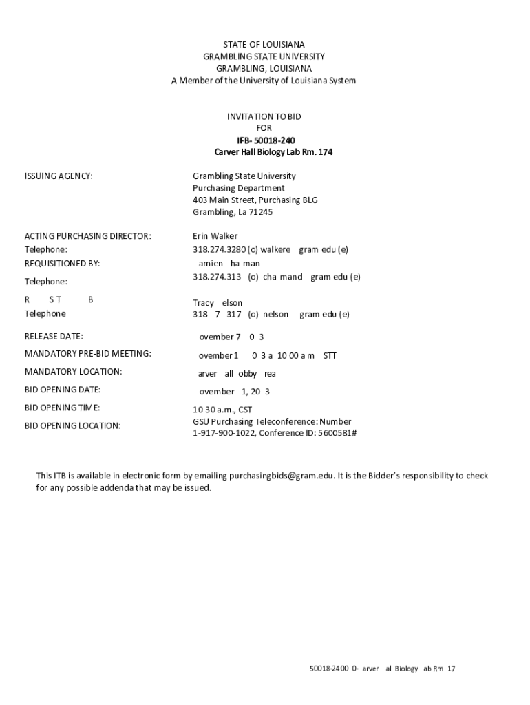 STATE OF LOUISIANA GAMBLING STATE UNIVERSITY GAMBLING, LOUISIANA A Member of the University of Louisiana System INVITATION TO BID FOR IF 50018240020 Carver Hall Biology Lab Rm. 174 ISSUING AGENCY:Gambling