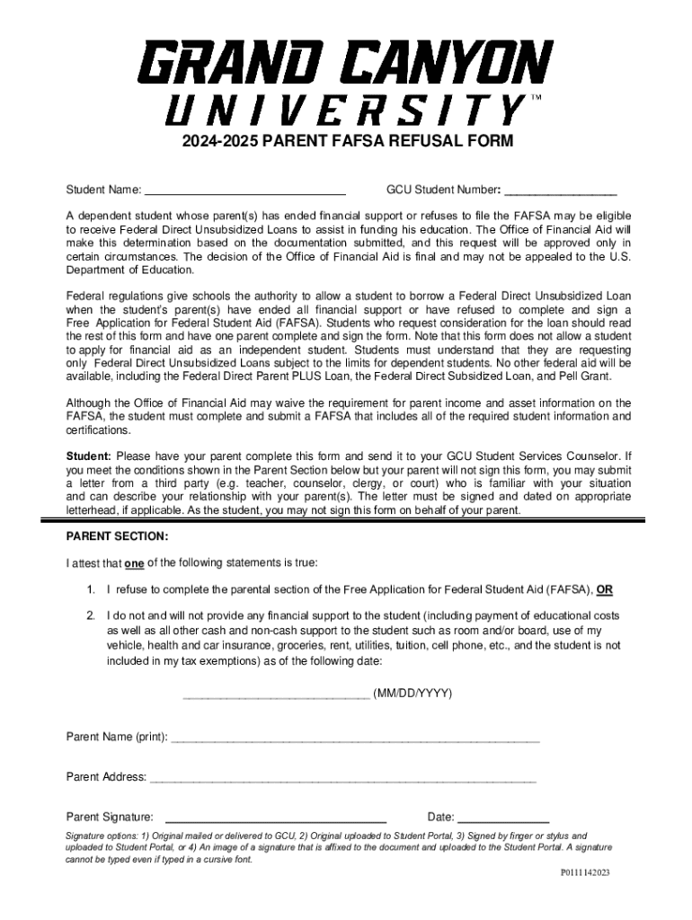 20242025 PARENT FAFSA REFUSAL FORM Student Name:GCU Student Number: ___A dependent student whose parent(s) has ended financial support or refuses to file the FAFSA may be eligible to receive Federal