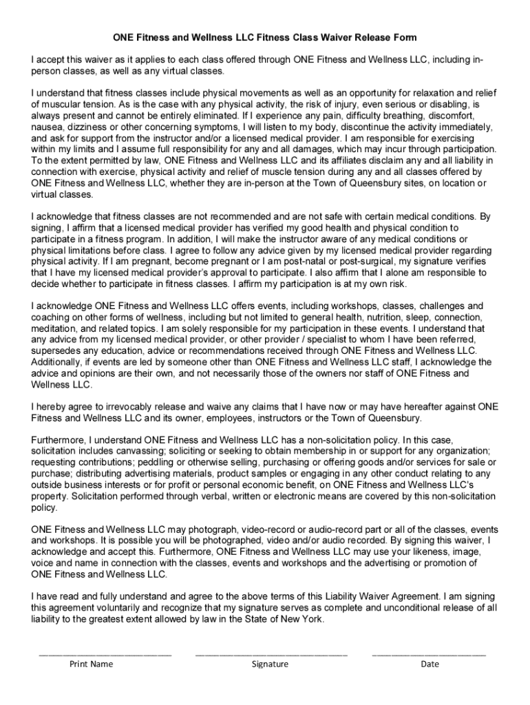 Get the free ONE Fitness and Wellness LLC Fitness Class Waiver Release Form ...