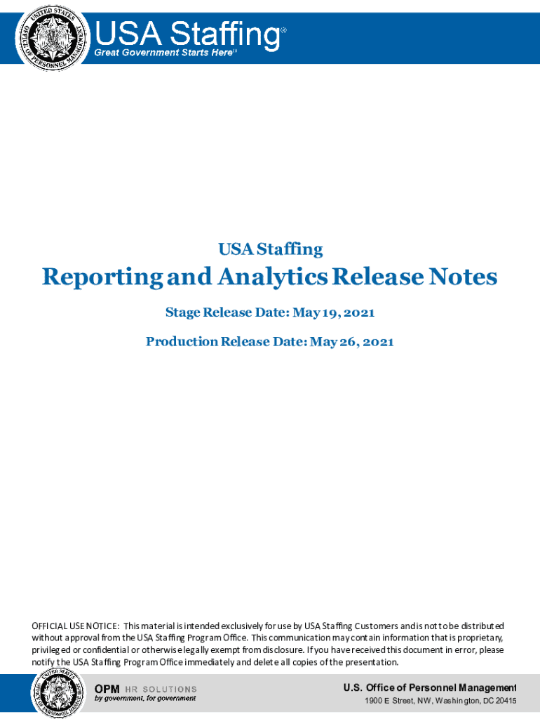 USA StaffingReporting and Analytics Release Notes Stage Release Date: May 19, 2021 Production Release Date: May 26, 2021OFFICIAL USE NOTICE: This material is intended exclusively for use by USA Staffing