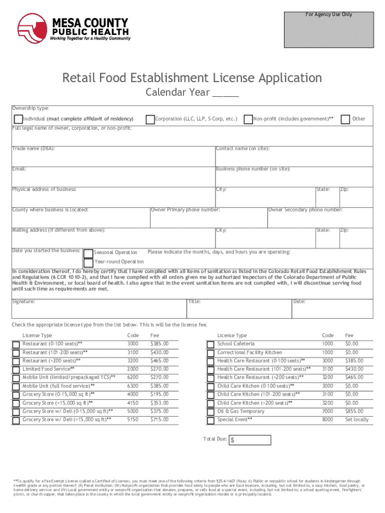 For Agency Use OnlyRetail Food Establishment License Application Calendar Year ___Ownership type: Individual (must complete affidavit of residency)Corporation (LLC, LLP, SCorp, etc.)Nonprofit (includes