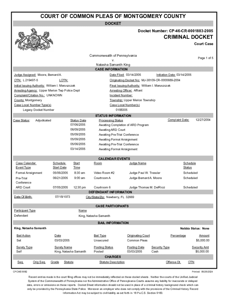 COURT OF COMMON PLEAS OF MONTGOMERY COUNTY DOCKET Number: CP46CR00018832005CRIMINAL DOCKET Court Case Commonwealth of Pennsylvania v. Natasha Samantha King CASE INFORMATION Page 1 of 5Judge Assigned: