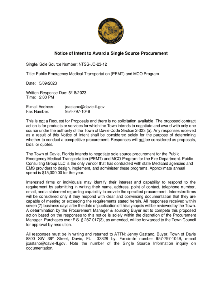 Notice of Intent to Award a Single Source Procurement Single/ Sole Source Number: NTSSJC2312 Title: Public Emergency Medical Transportation (PET) and MCO Program Date: 5/09/2023 Written Response Due: