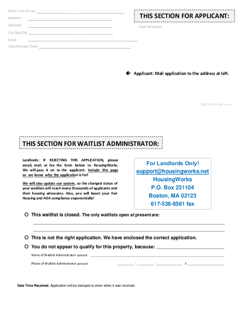 Name: First MI Last Address1:THIS SECTION FOR APPLICANT:Address2:Date Generated:City State Zip: Email: Case Manager Email: Applicant: Mail application to the address at left.Fold on this lineTHIS