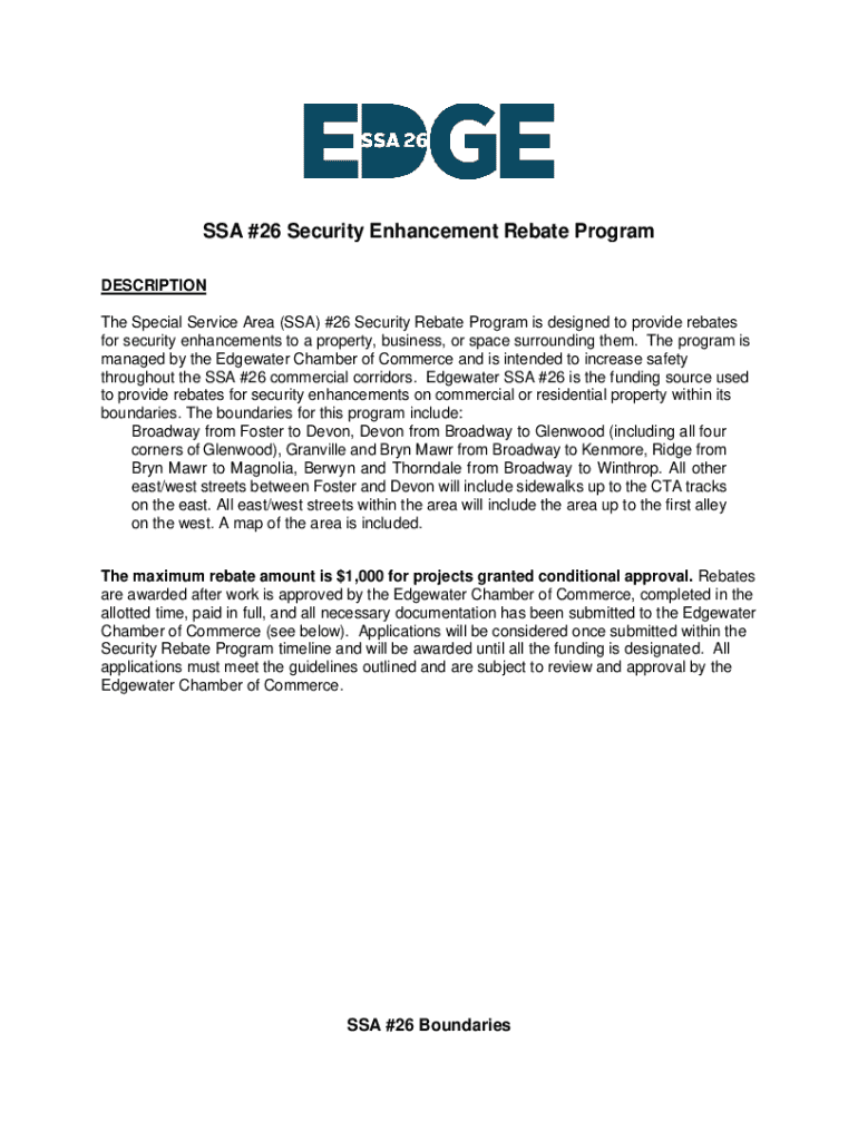 SSA #26 Security Enhancement Rebate Program DESCRIPTION The Special Service Area (SSA) #26 Security Rebate Program is designed to provide rebates for security enhancements to a property, business,