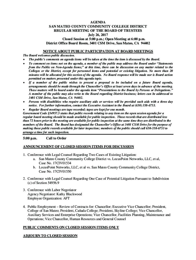 AGENDA SAN MATEO COUNTY COMMUNITY COLLEGE DISTRICT REGULAR MEETING OF THE BOARD OF TRUSTEES July 26, 2017, Closed Session at 5:00 p.m.; Open Meeting at 6:00 p.m. District Office Board Room, 3401 CSM