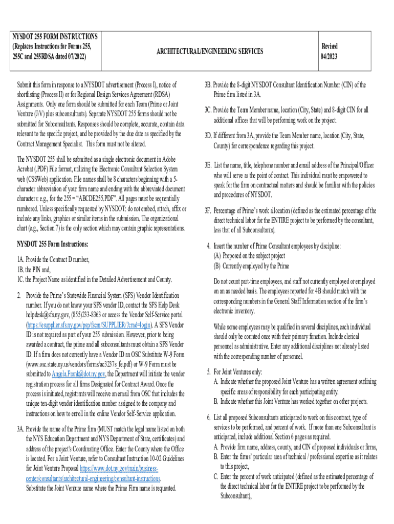NYSDOT 255 FORM INSTRUCTIONS (Replaces Instructions for Forms 255, 255C and 255RDSA dated 07/2022)ARCHITECTURAL/ENGINEERING SERVICESSubmit this form in response to a NYSDOT advertisement (Process