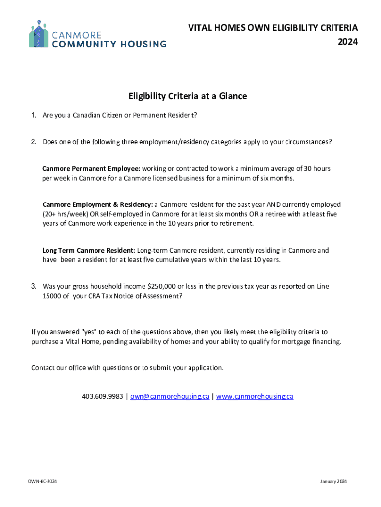 VITAL HOMES OWN ELIGIBILITY CRITERIA 2024Eligibility Criteria at a Glance 1. Are you a Canadian Citizen or Permanent Resident? 2. Does one of the following three employment/residency categories apply