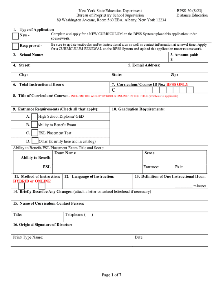 New York State Education Department Bureau of Proprietary School Supervision 89 Washington Avenue, Room 560 EBA, Albany, New York 12234BPSS30 (8/23) Distance Education1. Type of Application Complete