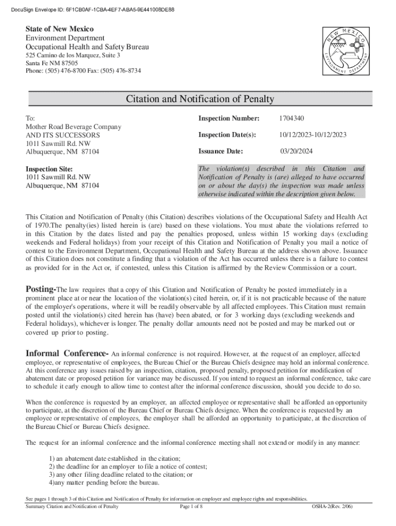 DocuSign Envelope ID: 6F1CB0AF1CBA4EF7ABA59E441008DE88State of New Mexico Environment Department Occupational Health and Safety Bureau 525 Camino de los Marquez, Suite 3 Santa Fe NM 87505 Phone: (505)