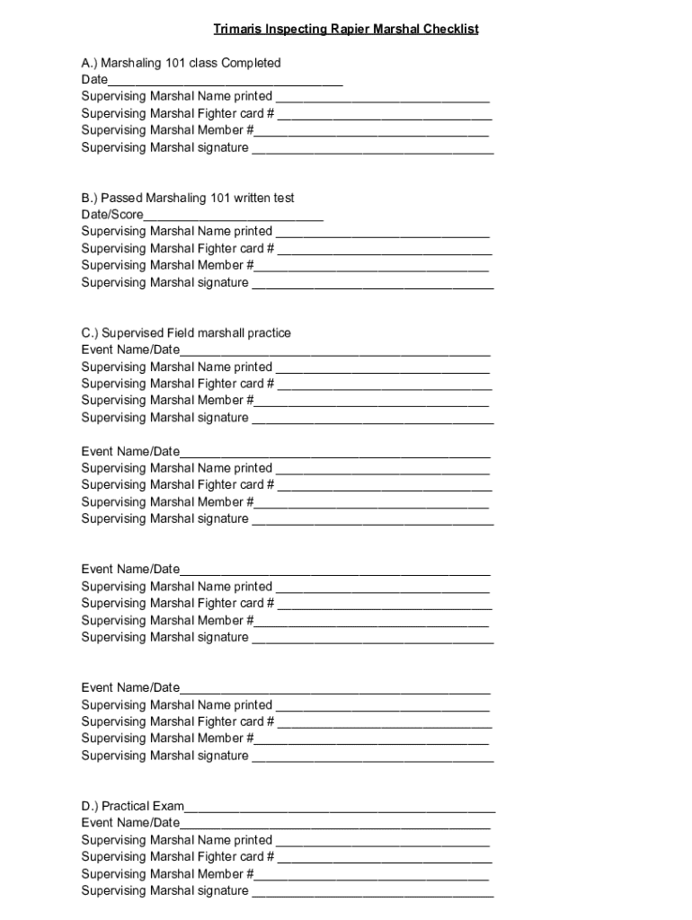 Primaries Inspecting Rapier Marshal Checklist A.) Marshaling 101 class Completed Date___ Supervising Marshal Name printed ___ Supervising Marshal Fighter card # ___ Supervising Marshal Member #___