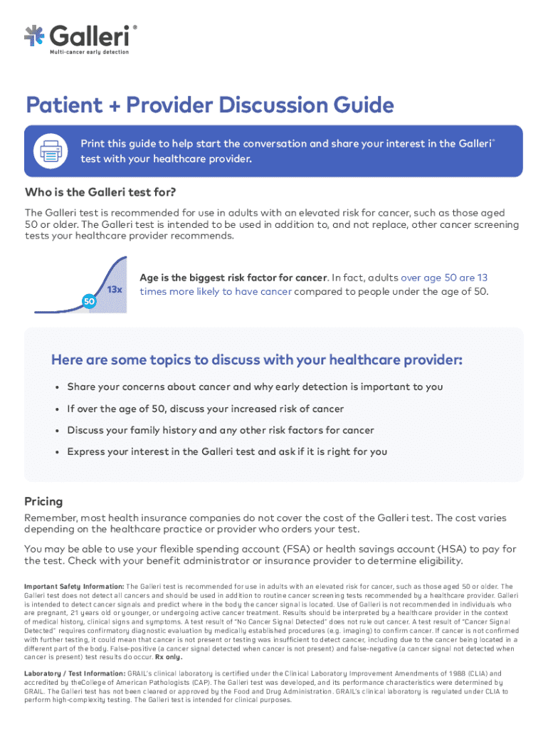 Patient + Provider Discussion Guide Print this guide to help start the conversation and share your interest in the Galleri test with your healthcare provider.Who is the Galleri test for? The Galleri