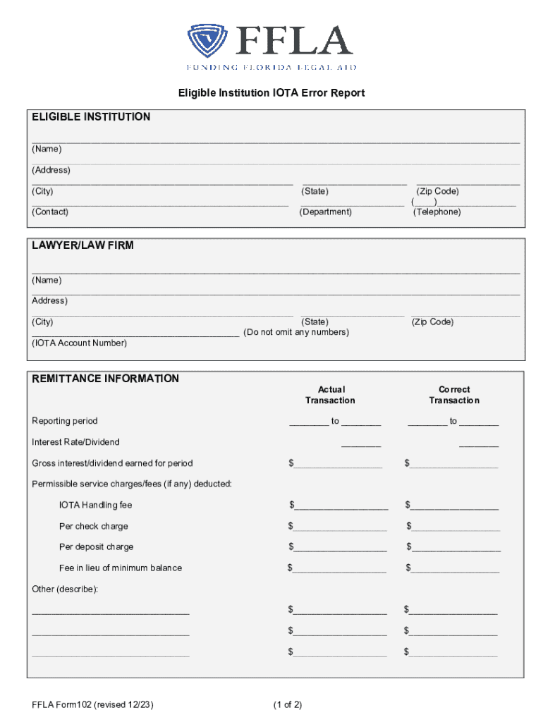 Eligible Institution IOTA Error Report ELIGIBLE INSTITUTION ___ (Name) ___ (Address) ___ ___ ___ (City) (State) (Zip Code) ___ ___ (___)___ (Contact) (Department) (Telephone)LAWYER/LAW FIRM ___ (Name)