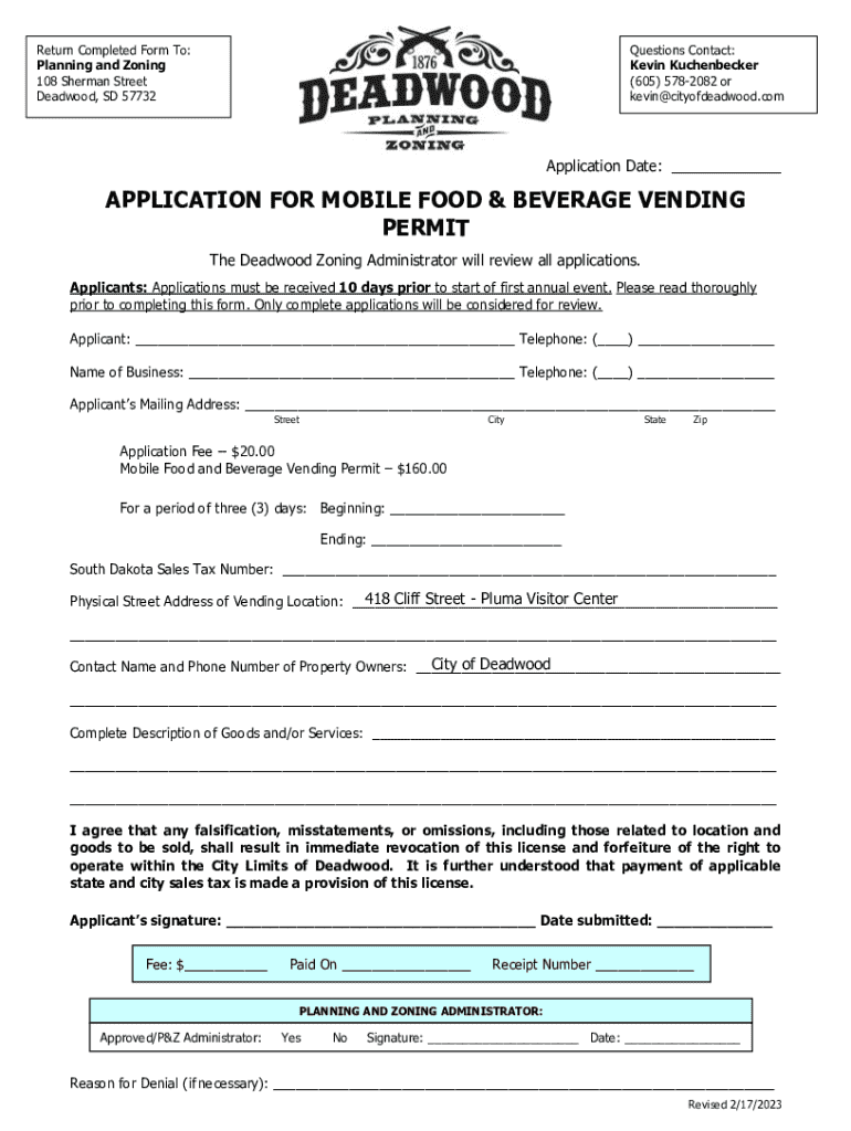 Return Completed Form To: Planning and Zoning 108 Sherman Street Deadwood, SD 57732Questions Contact: Kevin Kuchenbecker (605) 5782082 or kevin@cityofdeadwood.comApplication Date: ___APPLICATION FOR