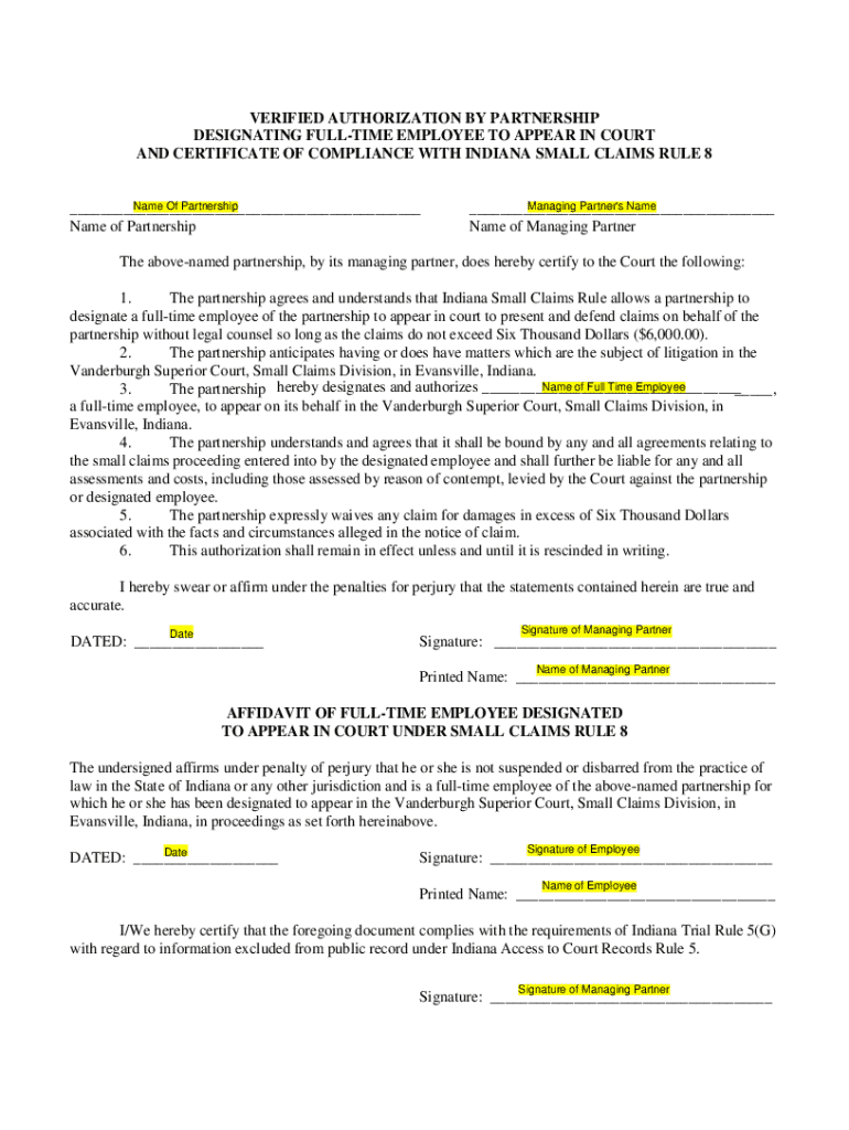 AND CERTIFICATE OF COMPLIANCE WITH INDIANA SMALL CLAIMS RULE 8Name Of Partnership
