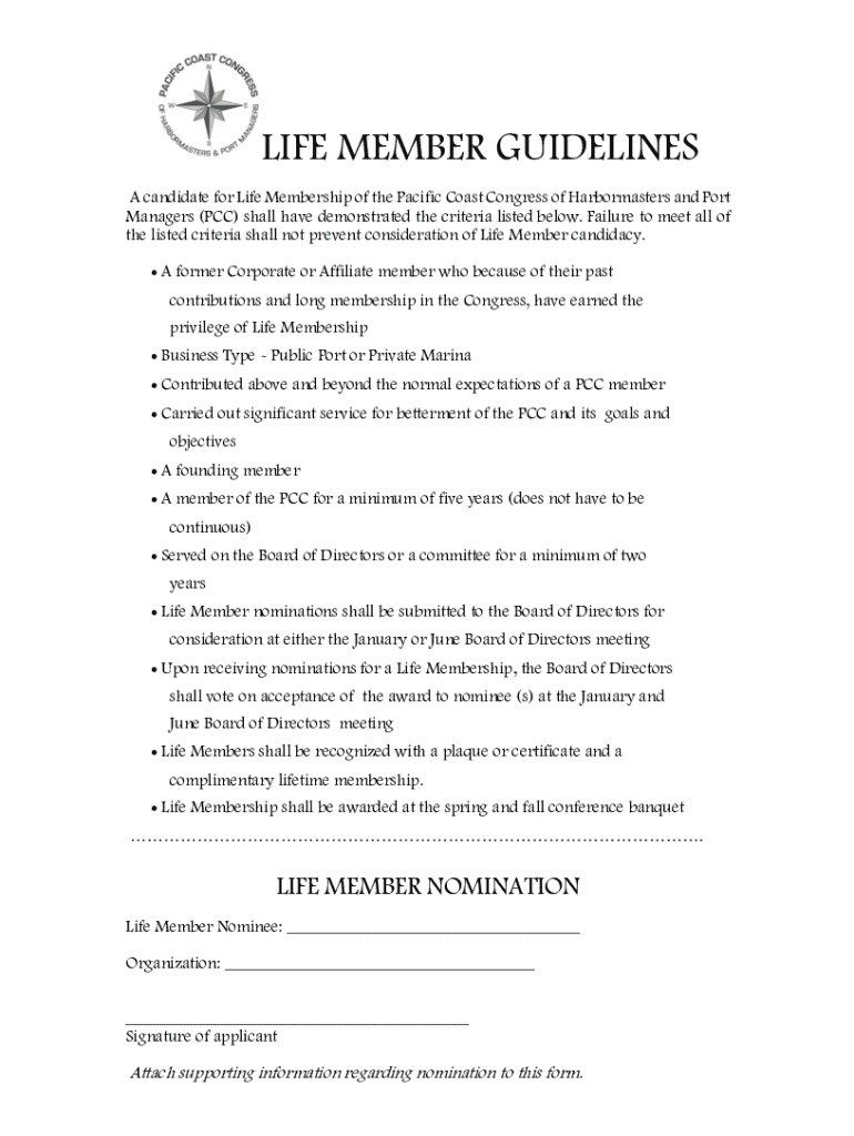 LIFE MEMBER GUIDELINES A candidate for Life Membership of the Pacific Coast Congress of Harbormasters and Port Managers (PCC) shall have demonstrated the criteria listed below. Failure to meet all