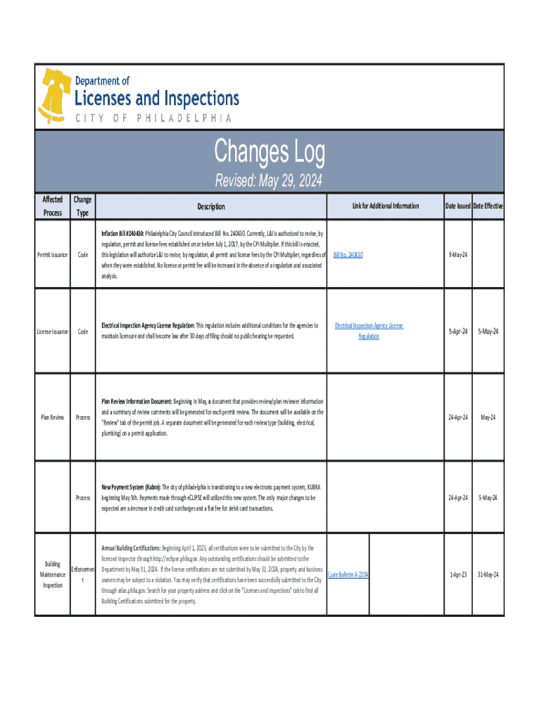 TypeDescriptionPermit issuanceCodeInflation Bill #240430: Philadelphia City Council introduced Bill No. 240430. Currently, L&I is authorized