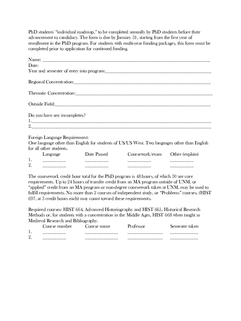 PhD students\' individual roadmap, to be completed annually by PhD students before their advancement to candidacy. The form is due by January 31, starting from the first year of enrollment in the