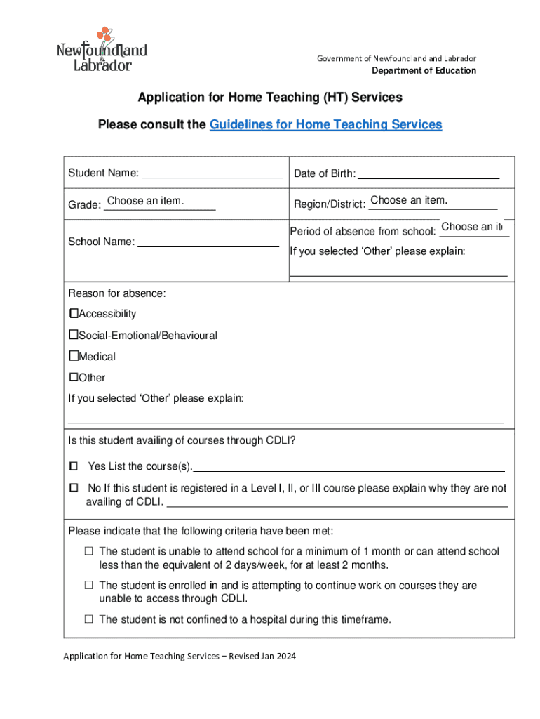 Government of Newfoundland and LabradorDepartment of EducationApplication for Home Teaching (HT) Services Please consult the Guidelines for Home Teaching ServicesStudent Name: ___ Date of Birth: ___