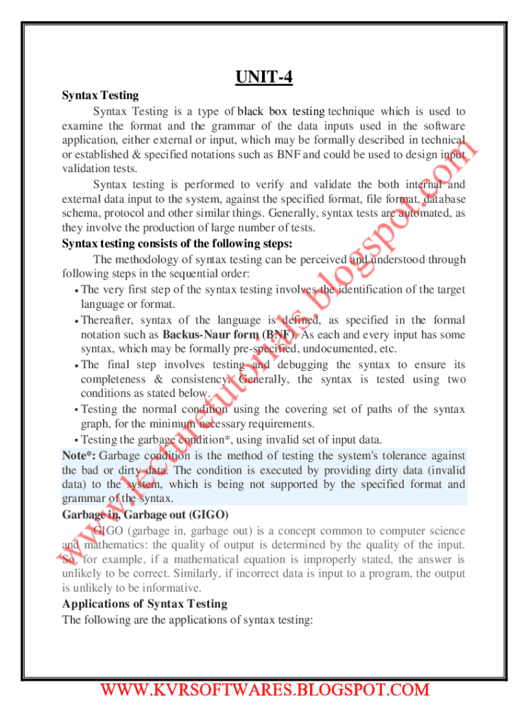 UNIT4 Syntax Testing Syntax Testing is a type of black box testing technique which is used to examine the format and the grammar of the data inputs used in the software application, either external