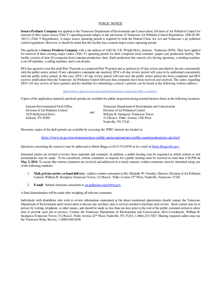PUBLIC NOTICE Monaco Products Company has applied to the Tennessee Department of Environment and Conservation, Division of Air Pollution Control for renewal of their major source (Title V) operating