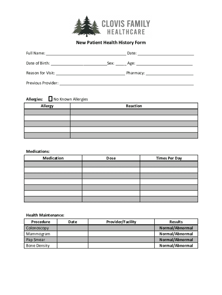 New Patient Health History Form Full Name: ___ Date: ___ Date of Birth: ___Sex: ___ Age: ___ Reason for Visit: ___ Pharmacy: ___ Previous Provider: ___Allergies: No Known Allergies AllergyMedications: