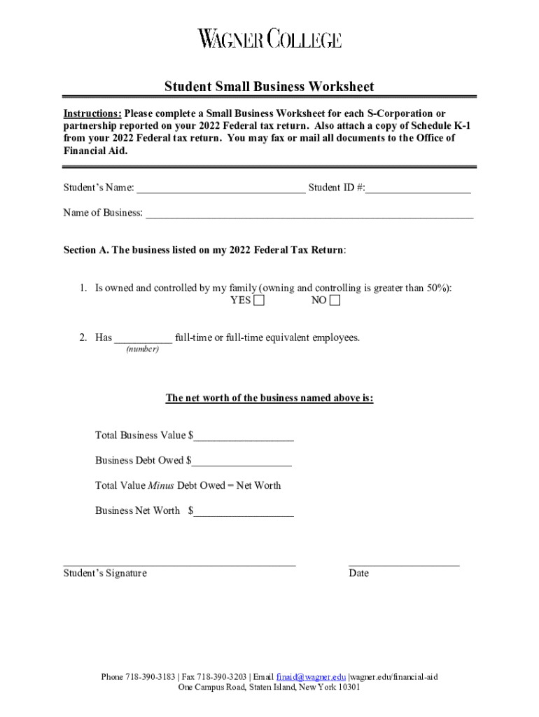 Student Small Business Worksheet Instructions: Please complete a Small Business Worksheet for each Corporation or partnership reported on your 2022 Federal tax return. Also attach a copy of Schedule