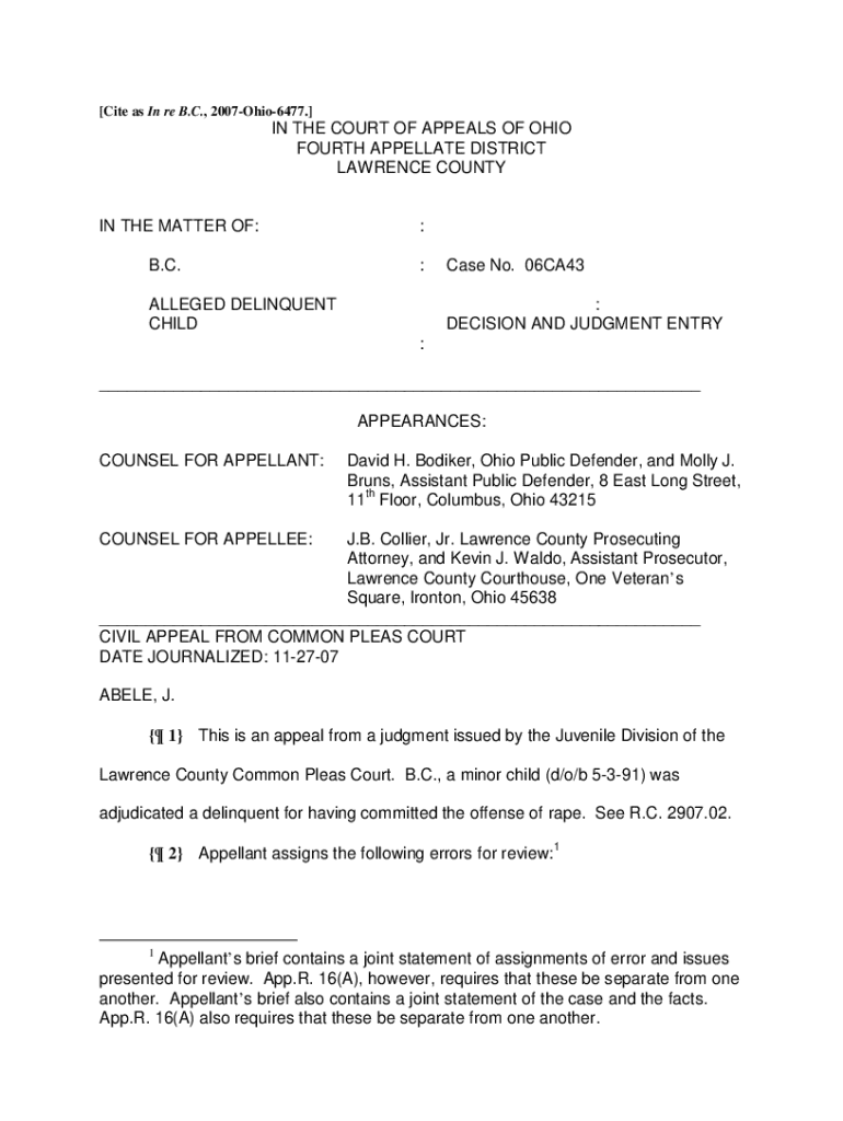 [Cite as In re B.C., 2007Ohio6477.]IN THE COURT OF APPEALS OF OHIO FOURTH APPELLATE DISTRICT LAWRENCE COUNTYIN THE MATTER OF: B.C.: :ALLEGED DELINQUENT CHILDCase No. 06CA43 : DECISION AND JUDGMENT