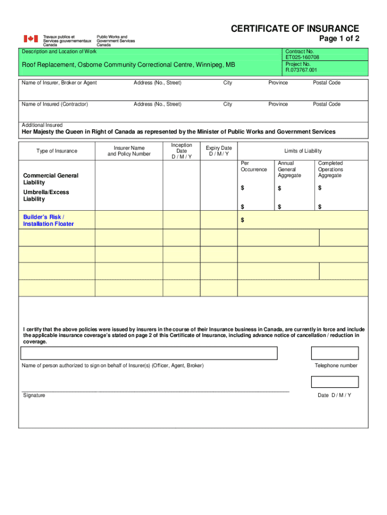 CERTIFICATE OF INSURANCE Page 1 of 2 Description and Location of WorkContract No. ET025160708 Project No. R.073767.001Roof Replacement, Osborne Community Correctional Centre, Winnipeg, MB Name of