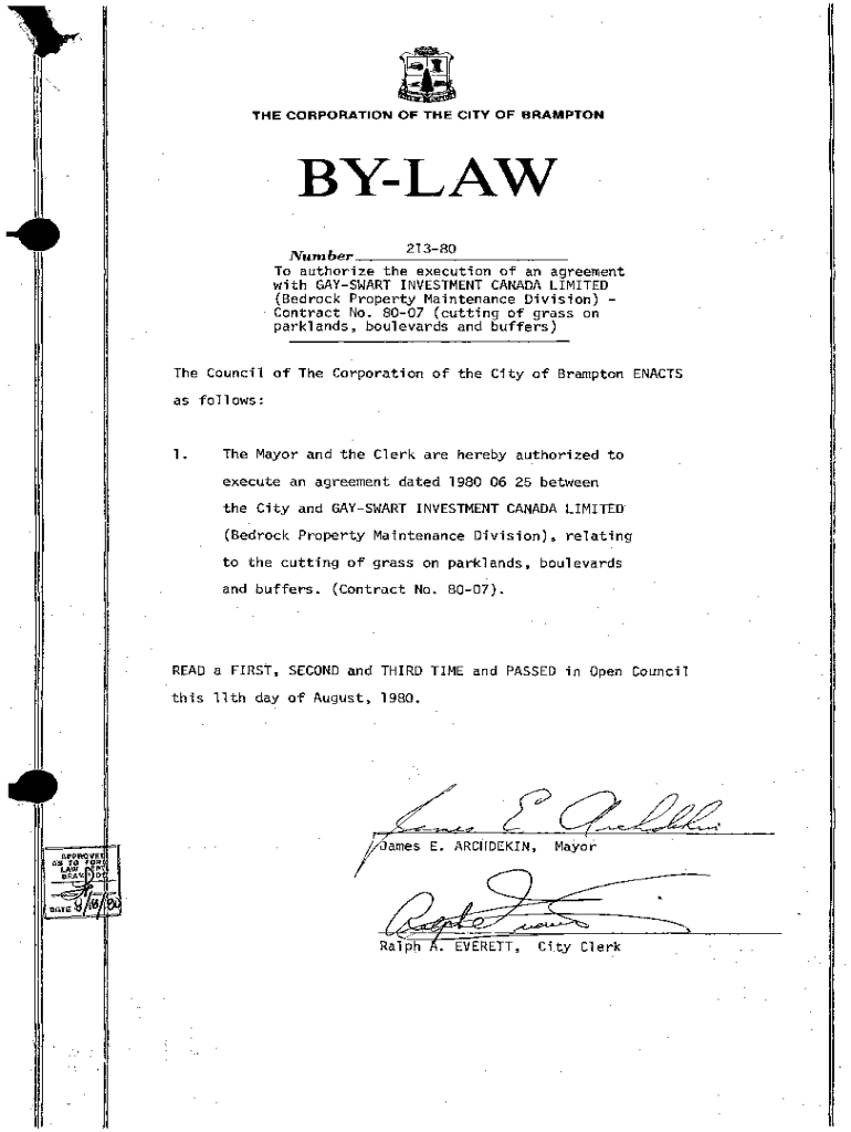 \”.THE CORPORATION OF THE CITY OF BRAMPTONBYLAW Number ___2_1_3__80_ _ _ _ __To authorize the execution of an agreement with HAYWARD INVESTMENT CANADA LIMITED (Bedrock Property Maintenance Division).