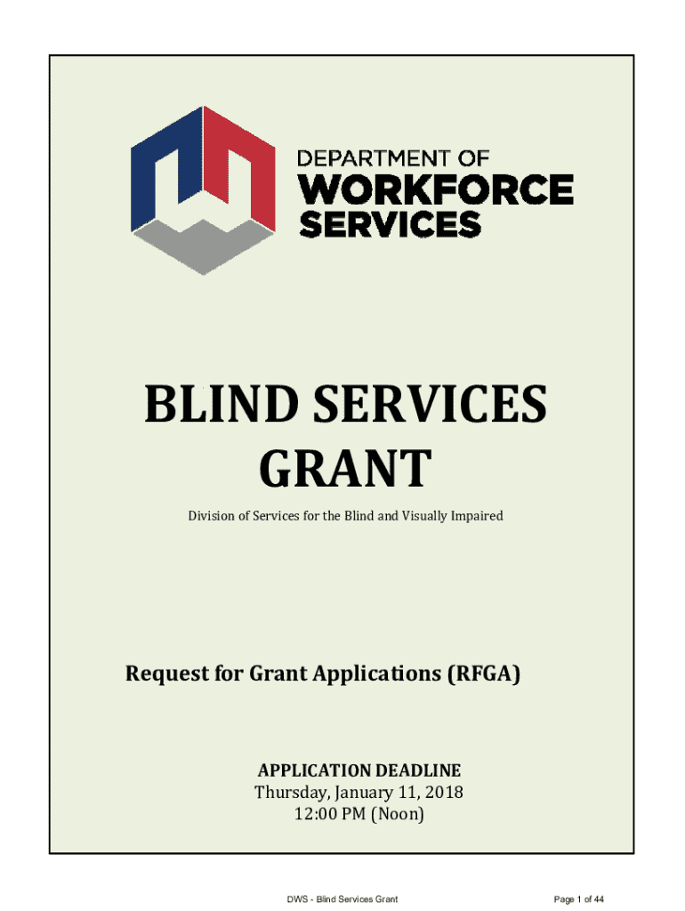 BLIND SERVICESGRANT Division of Services for the Blind and Visually ImpairedRequest for Grant Applications (RFGA)APPLICATION DEADLINEThursday, January 11, 201812:00 PM (Noon)DWS Blind Services GrantPage