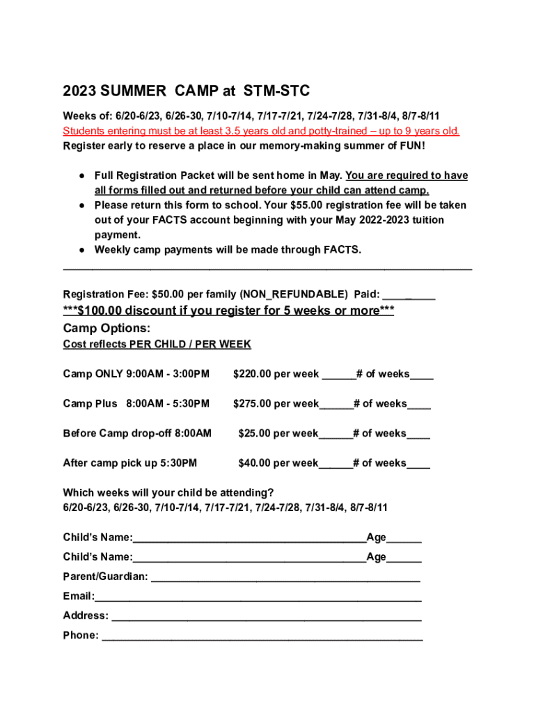 2023 SUMMER CAMP at STMSTC Weeks of: 6/206/23, 6/2630, 7/107/14, 7/177/21, 7/247/28, 7/318/4, 8/78/11 Students entering must be at least 3.5 years old and pottytrained up to 9 years old. Register
