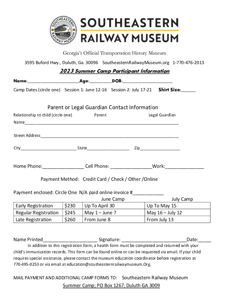Georgia's Official Transportation History Museum 3595 Buford Hwy., Duluth, Ga. 30096 SoutheasternRailwayMuseum.org 177047620132023 Summer Camp Participant Information Name:___Age:___DOB:___Camp Dates