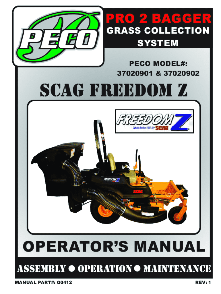 PPECOPRO 2 BIGGER GRASS COLLECTION SYSTEM PESO MODEL#: 37020901 & 37020902SCAG FREEDOM OPERATORS MANUAL ASSEMBLY MANUAL PART#: Q0412OPERATIONMAINTENANCE REV: 1RESIDENTIAL BAGGING SYSTEM TABLE OF CONTENTS