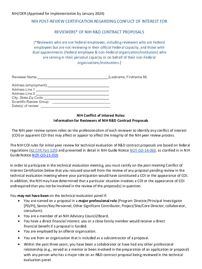 NIH/OR (Approved for implementation by January 2024)NIH PREVIEW CERTIFICATION REGARDING CONFLICT OF INTEREST FOR REVIEWERS* OF NIH R&D CONTRACT PROPOSALS (*Reviewers who are not Federal employees,