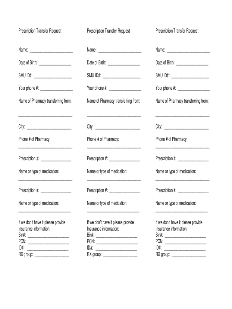 Prescription Transfer RequestPrescription Transfer RequestPrescription Transfer RequestName: ___Name: ___Name: ___Date of Birth: ___Date of Birth: ___Date of Birth: ___SMU ID#: ___SMU ID#: ___SMU