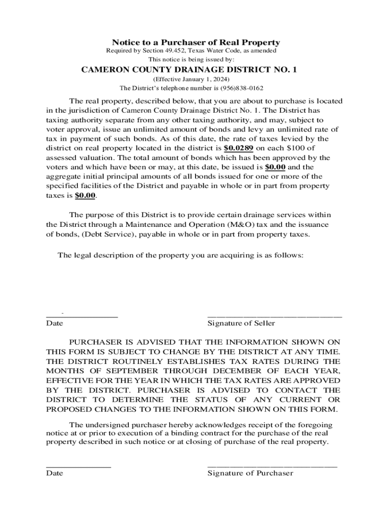 Notice to a Purchaser of Real Property Required by Section 49.452, Texas Water Code, as amended This notice is being issued by:CAMERON COUNTY DRAINAGE DISTRICT NO. 1 (Effective January 1, 2024) The