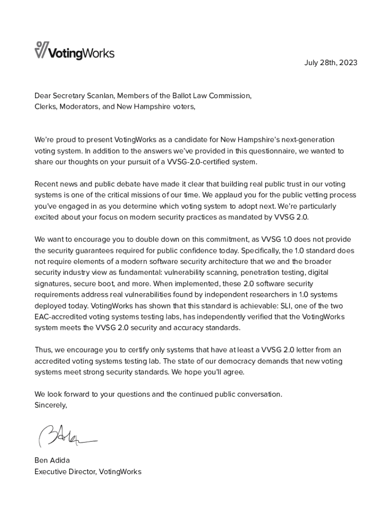 July 28th, 2023Dear Secretary Scandal, Members of the Ballot Law Commission, Clerks, Moderators, and New Hampshire voters, Were proud to present VotingWorks as a candidate for New Hampshire's next