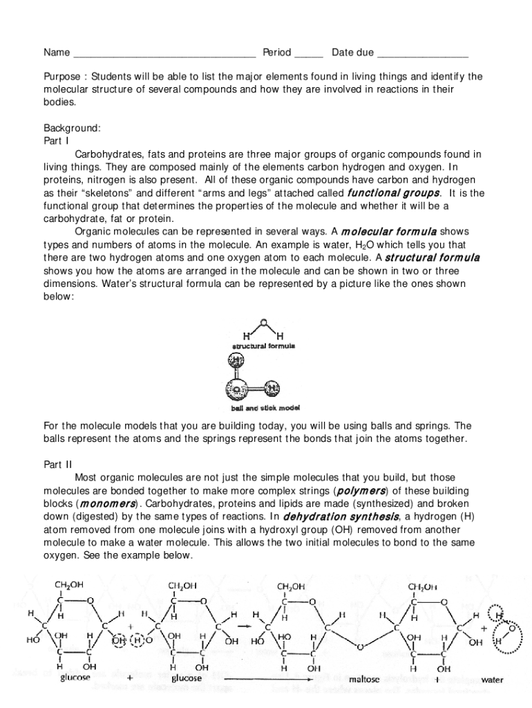 Name ___ Period ___ Date due ___ Purpose : Students will be able to list the major elements found in living things and identify the molecular structure of several compounds and how they are involved