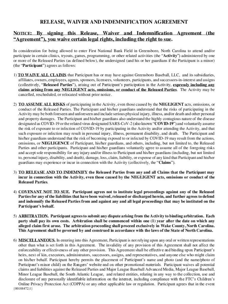 RELEASE, WAIVER AND INDEMNIFICATION AGREEMENT NOTICE: By signing this Release, Waiver and Indemnification Agreement (the Agreement), you waive certain legal rights, including the right to sue. In
