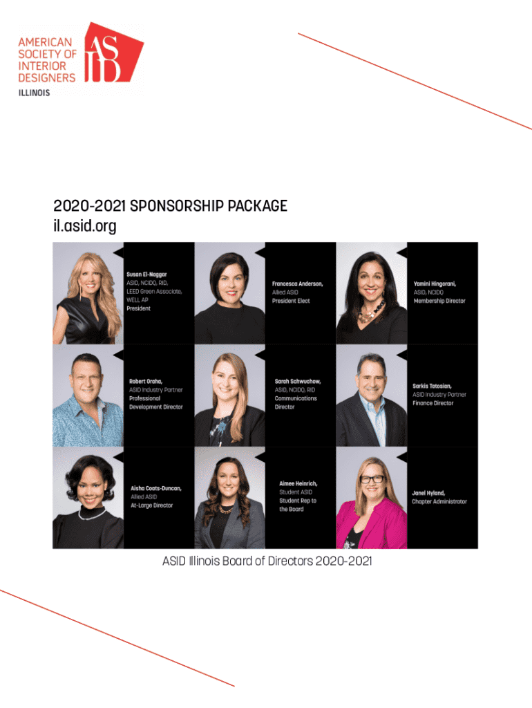 20202021 SPONSORSHIP PACKAGE il.asid.orgASID Illinois Board of Directors 20202021Board of Directors Susan ElNaggar ASID, NCIDQ, RID, WELL AP, LEED Green Associate President Francesca Anderson Allied